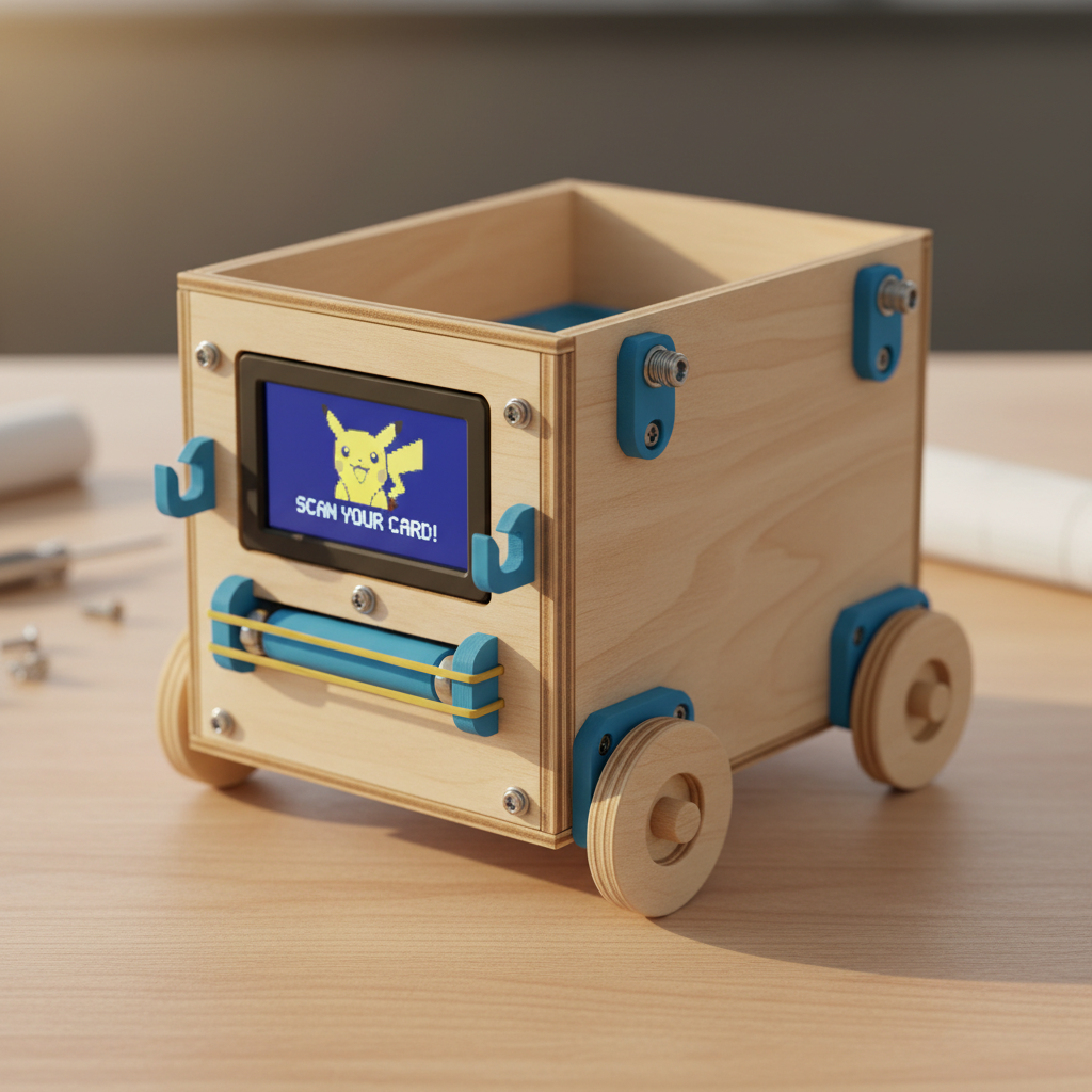 Build your own electronic Pokémon card storage box with a working LCD display and card scanner slot. Scan cards through the slot to "catch" them digitally, then store your physical cards safely inside the hinged storage compartment.
