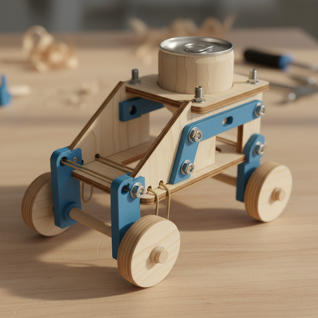 Every kit in this gallery was designed by artificial intelligence based on a real kid's idea. InventShack uses AI to select from a library of parametric components — laser-cut birchwood panels, 3D-printed PLA brackets, rubber band hooks, axle mounts, and more — then engineers a complete, buildable project with real M3 hardware and step-by-step assembly instructions.