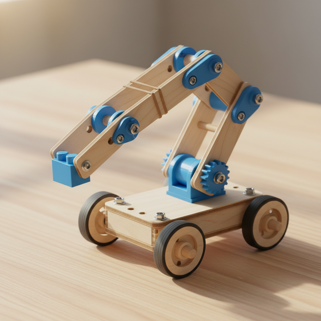 Create your own robotic arm that can pick up and move small objects around your desk or bedroom. Use rubber band power to make the gripper open and close, and manually position the arm to grab toys, pencils, or other lightweight items.