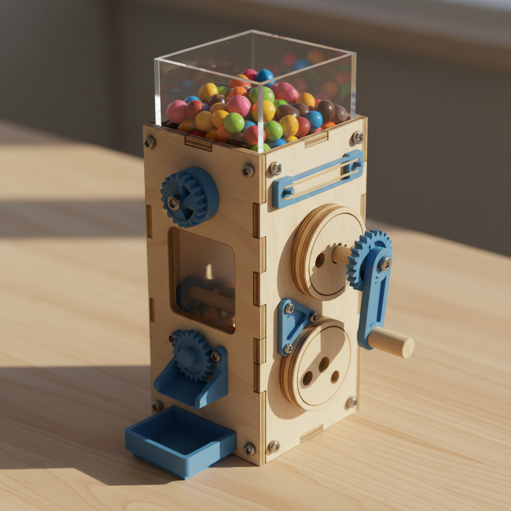 This mechanical candy dispenser uses a sliding gate mechanism to control the flow of small candies or treats. Turn the handle to open the gate and dispense the perfect amount every time!